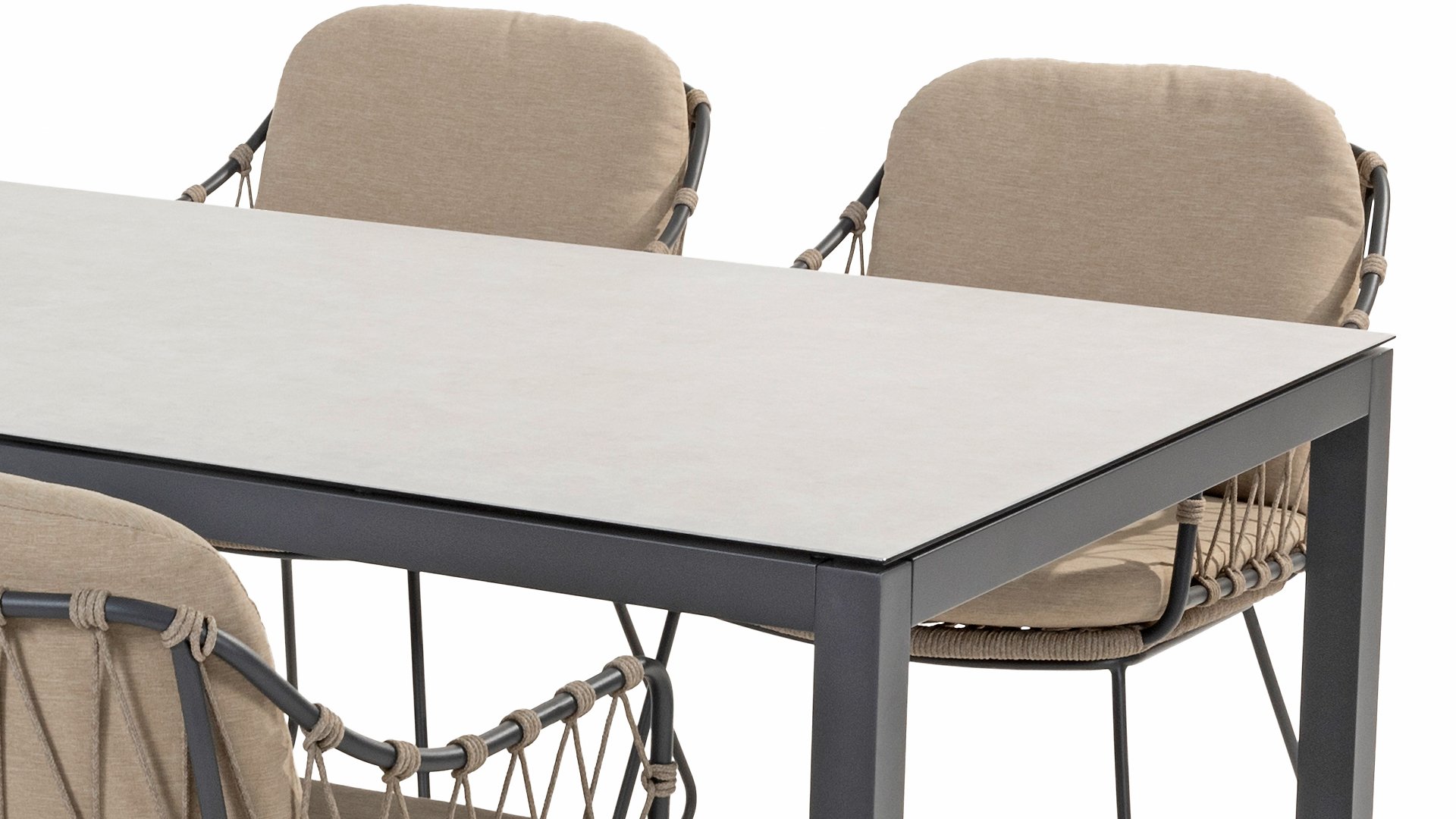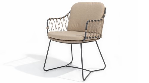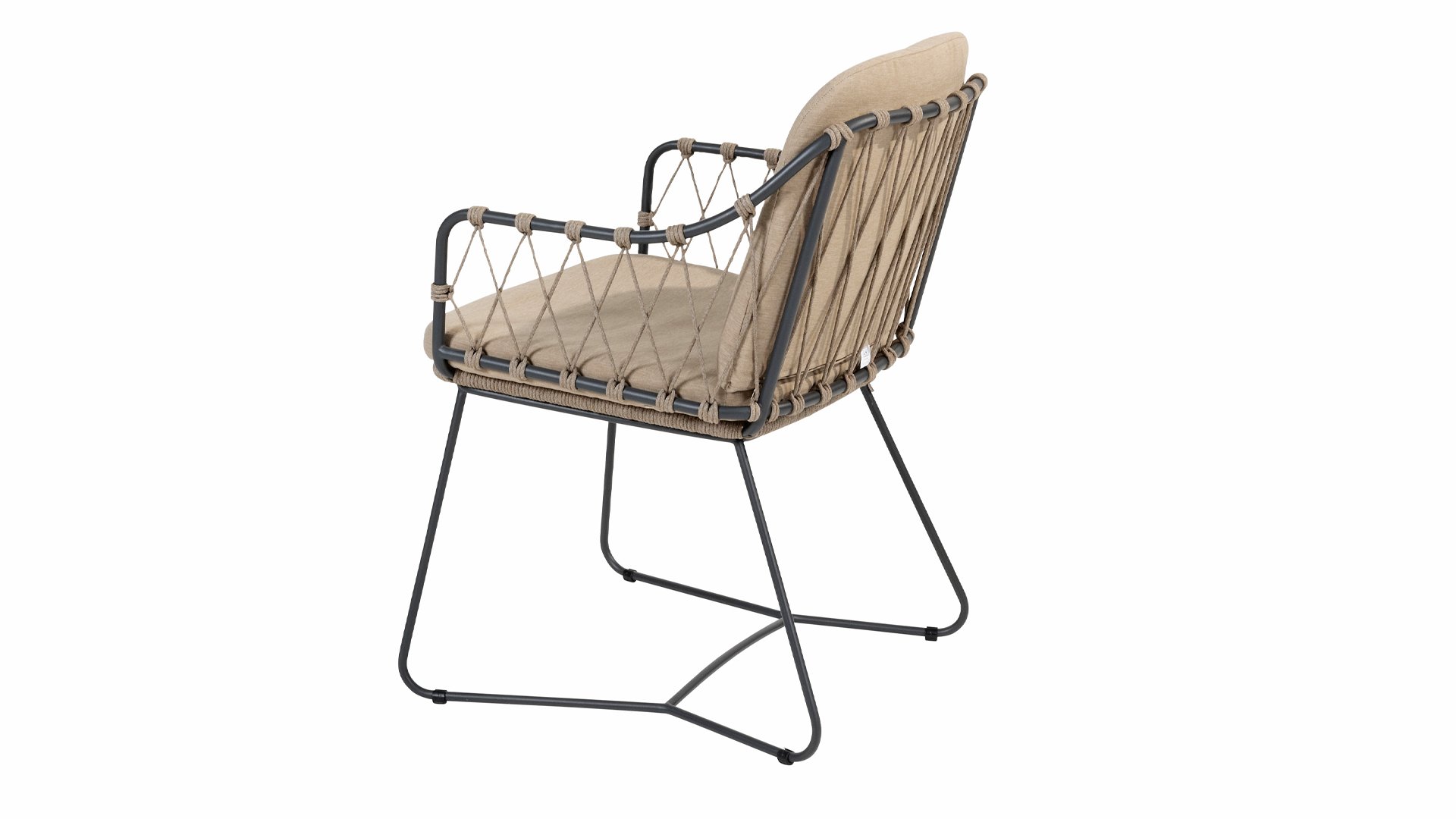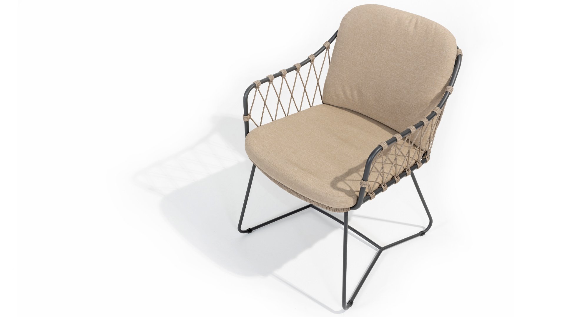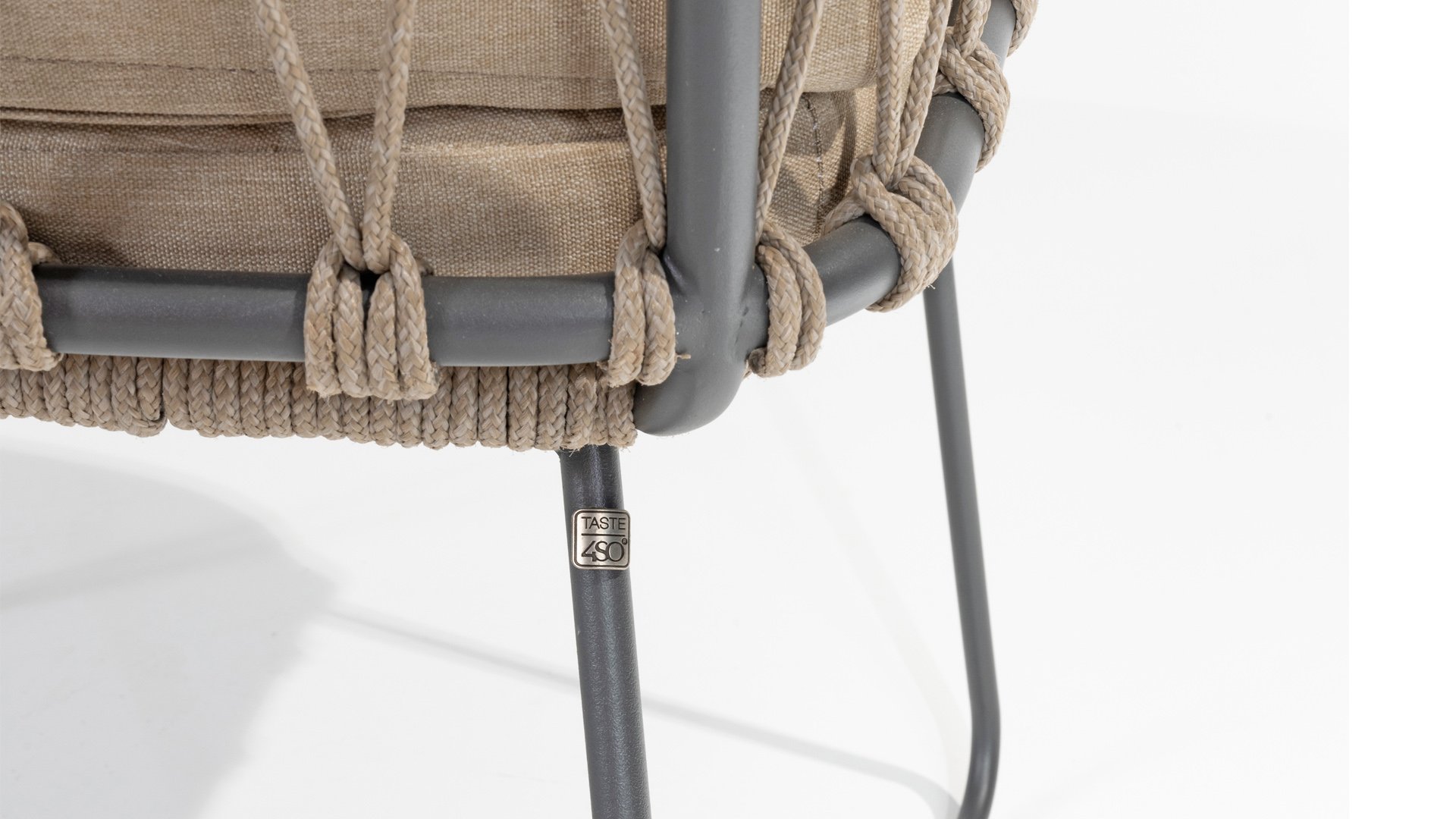 The Prego dining chair is made with high-quality taupe rope and has a sturdy frame of anthracite stainless steel and aluminum, making it resistant to changing weather conditions. The included cushions provide extra comfort during long, relaxed dinners or cozy gatherings outdoors.
