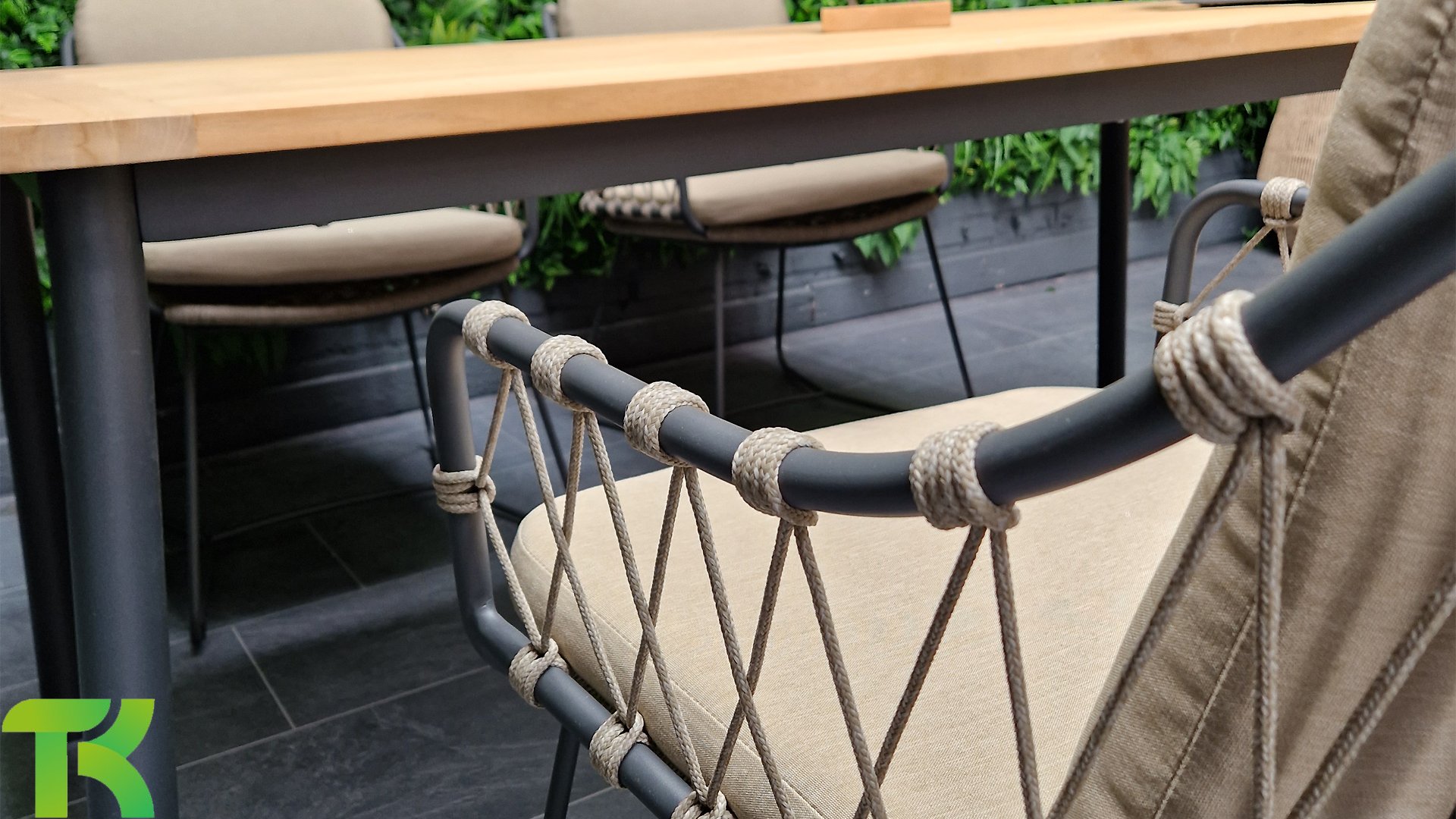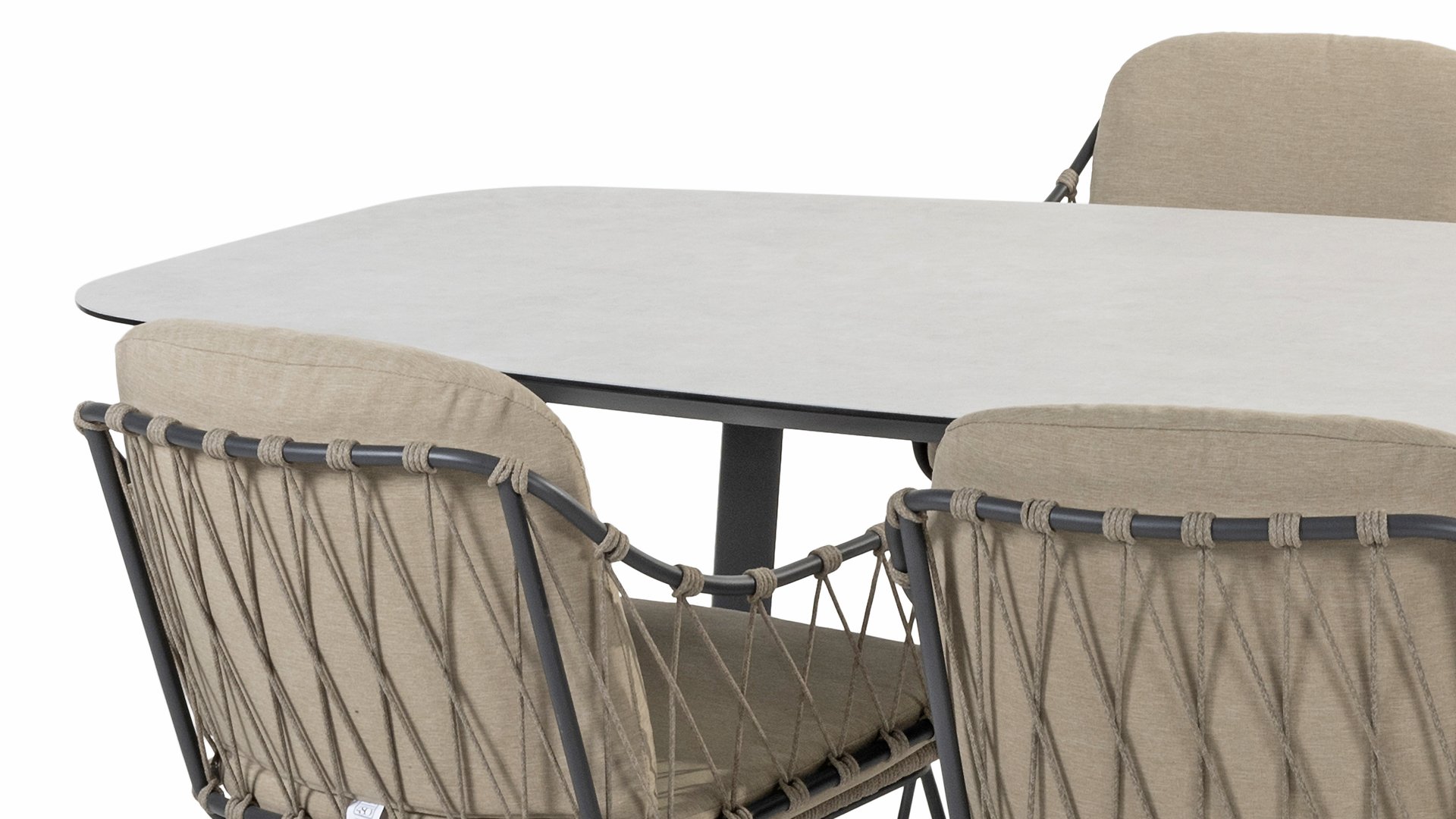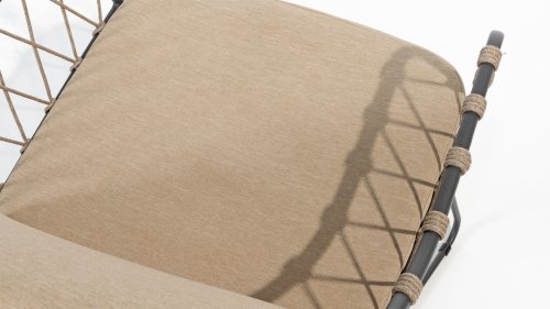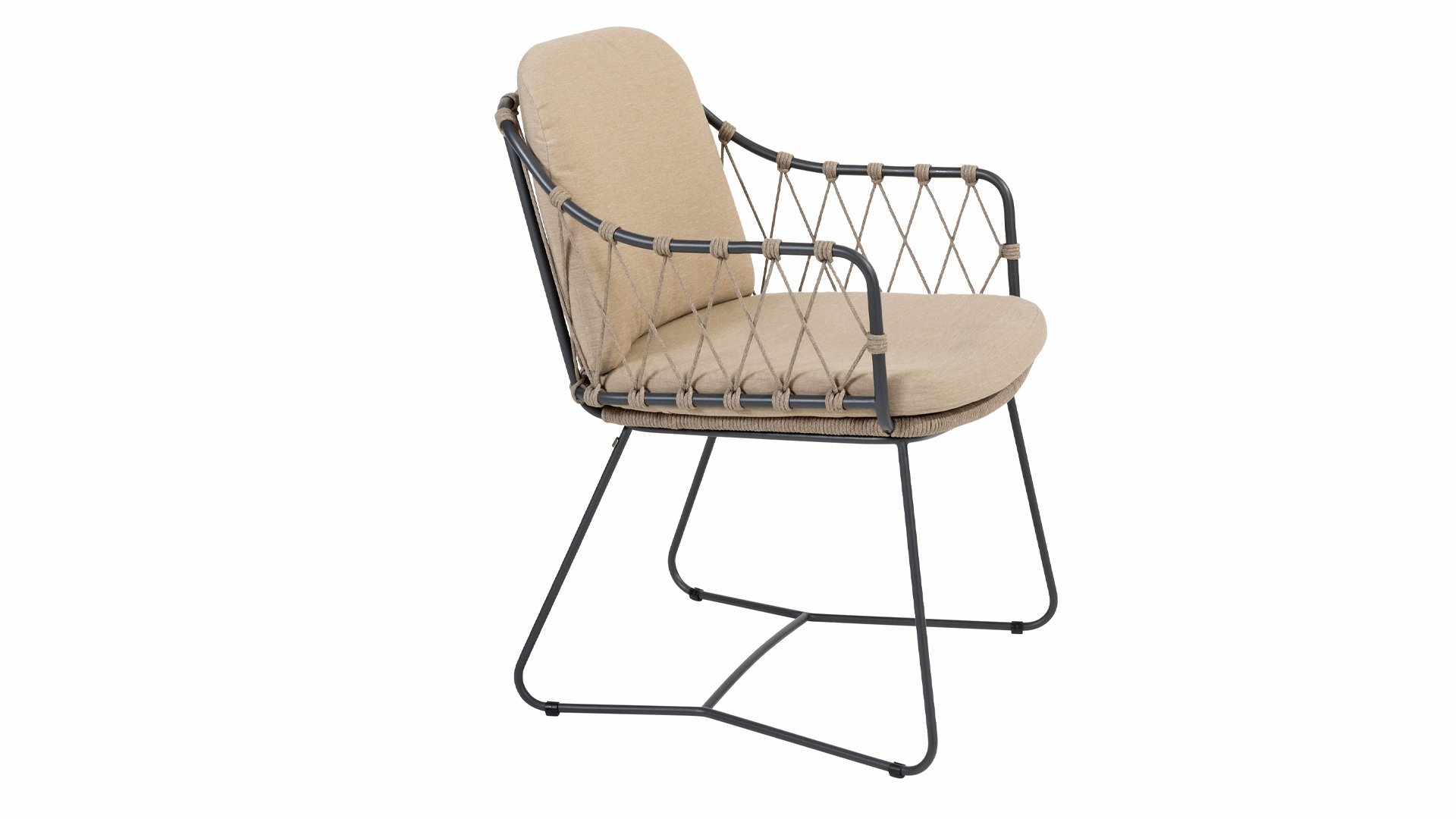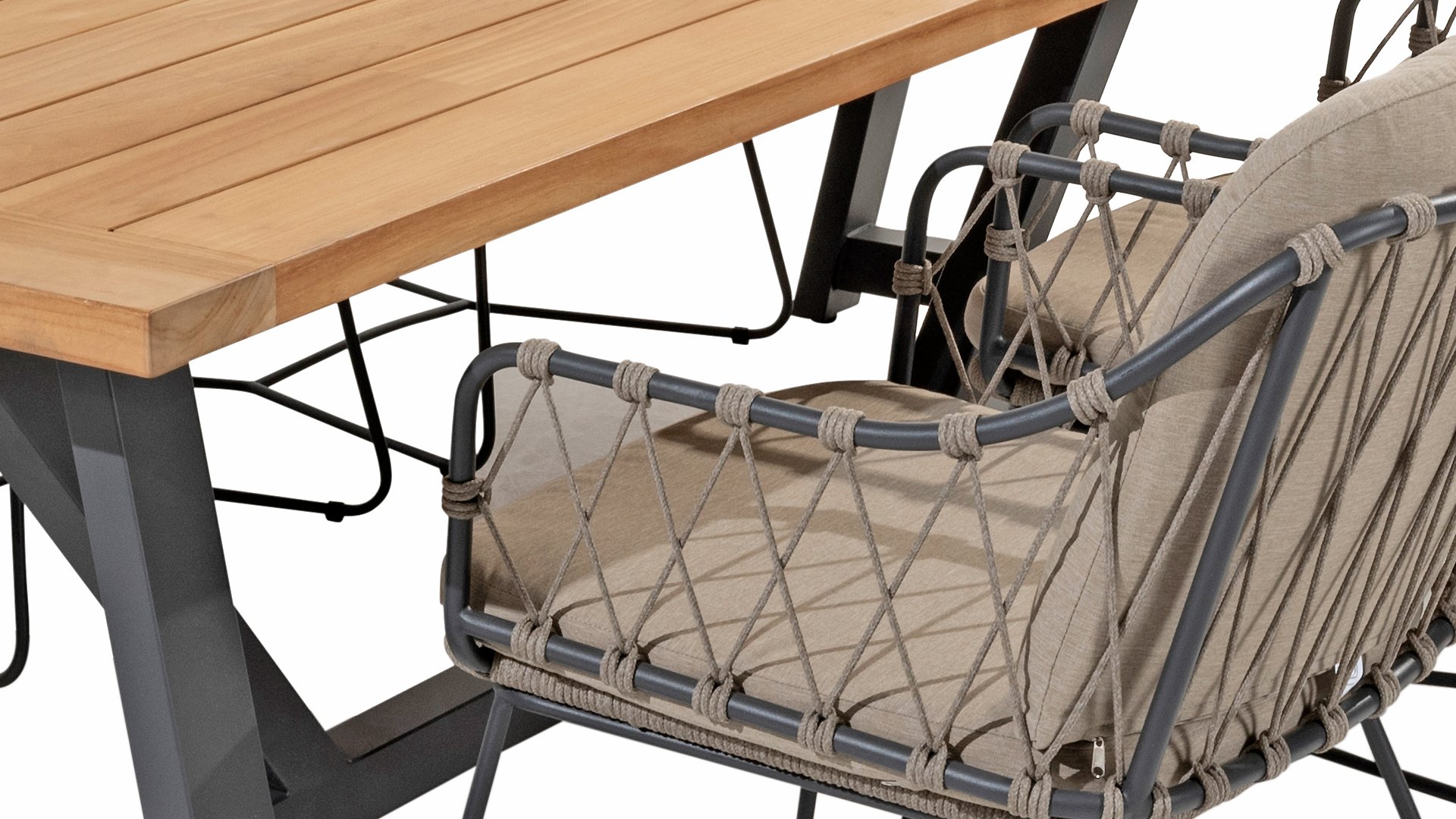 The Prego dining chair is made with high-quality taupe rope and has a sturdy frame of anthracite stainless steel and aluminum, making it resistant to changing weather conditions. The included cushions provide extra comfort during long, relaxed dinners or cozy gatherings outdoors.