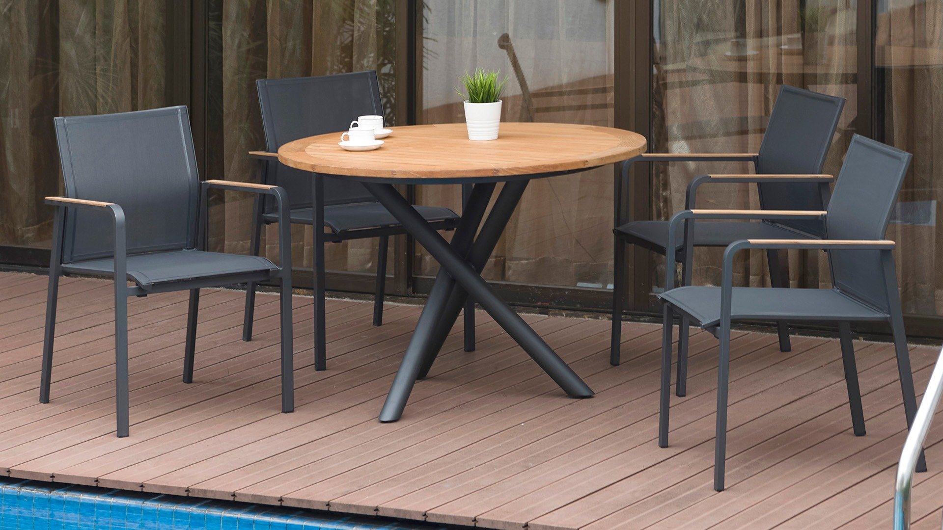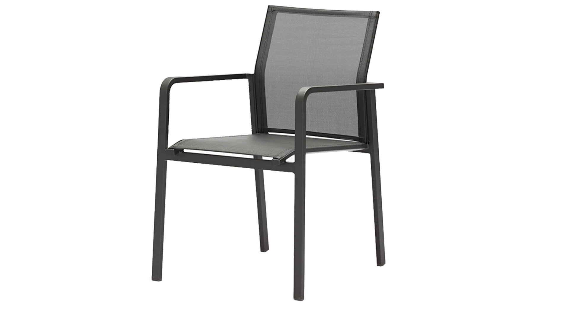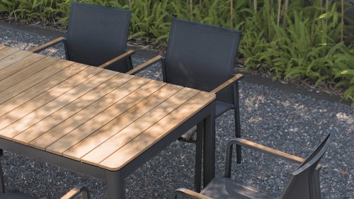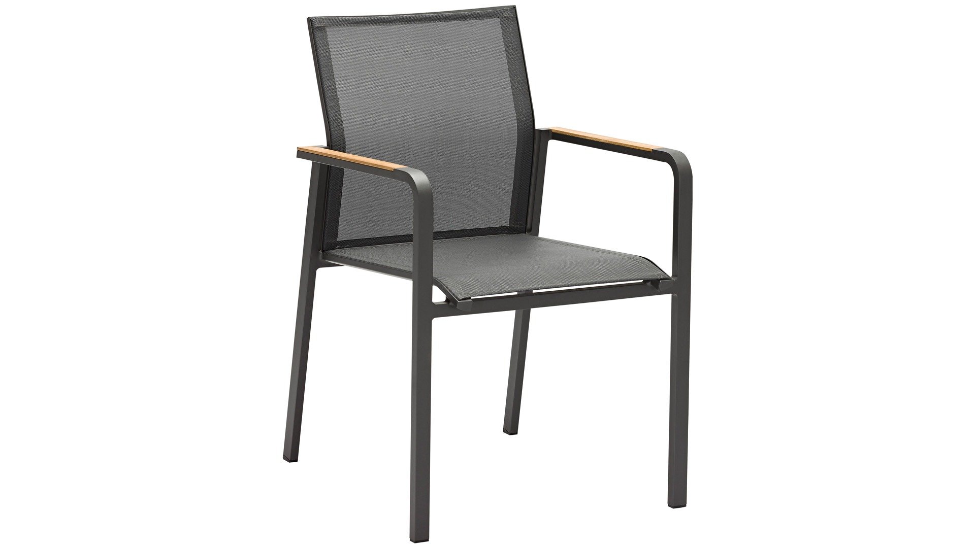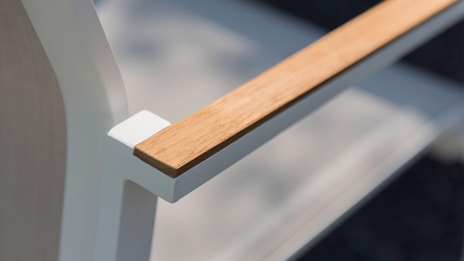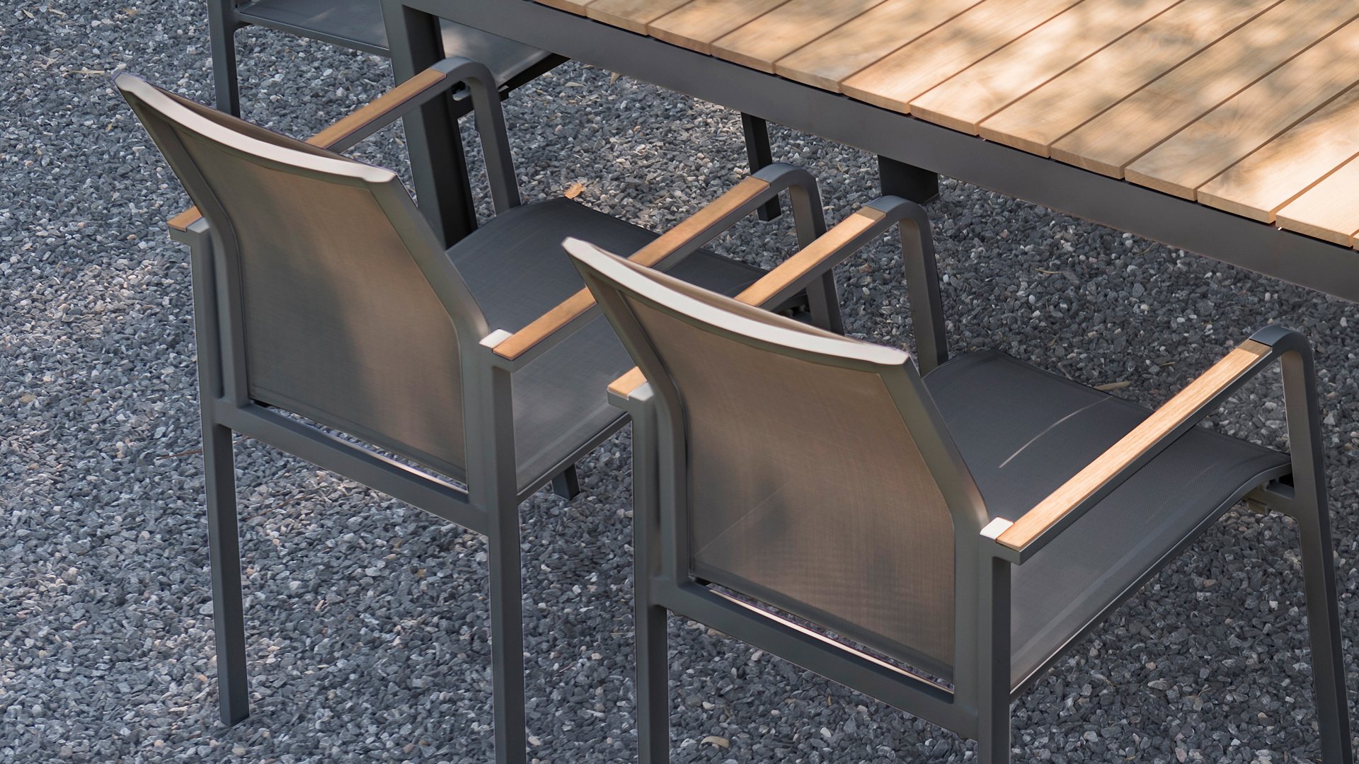 The Zebra Greenline Bee dining chair stackable series. The frame of the Graphite Bee Stackable chair is made of powder-coated aluminum and covered with a Carbon Grey colored Batyline® fabric. The Bee Stackable chair White has a Light Grey seat. The Batyline® Textilene used is a proven synthetic fabric that is breathable and tear-resistant for several years. The Greenline series from Zebra combines contemporary, ecology, and sustainability. In the corporate-concept Greenline, the issue of sustainability and the selection of environmentally friendly materials are combined to create comfortable, beautifully designed, timeless furniture. The Zebra Bee garden chair is a beautiful comfortable chair with teak armrests. These armrests have a Natural Finish that matches nicely with the Bee and Mikado table.