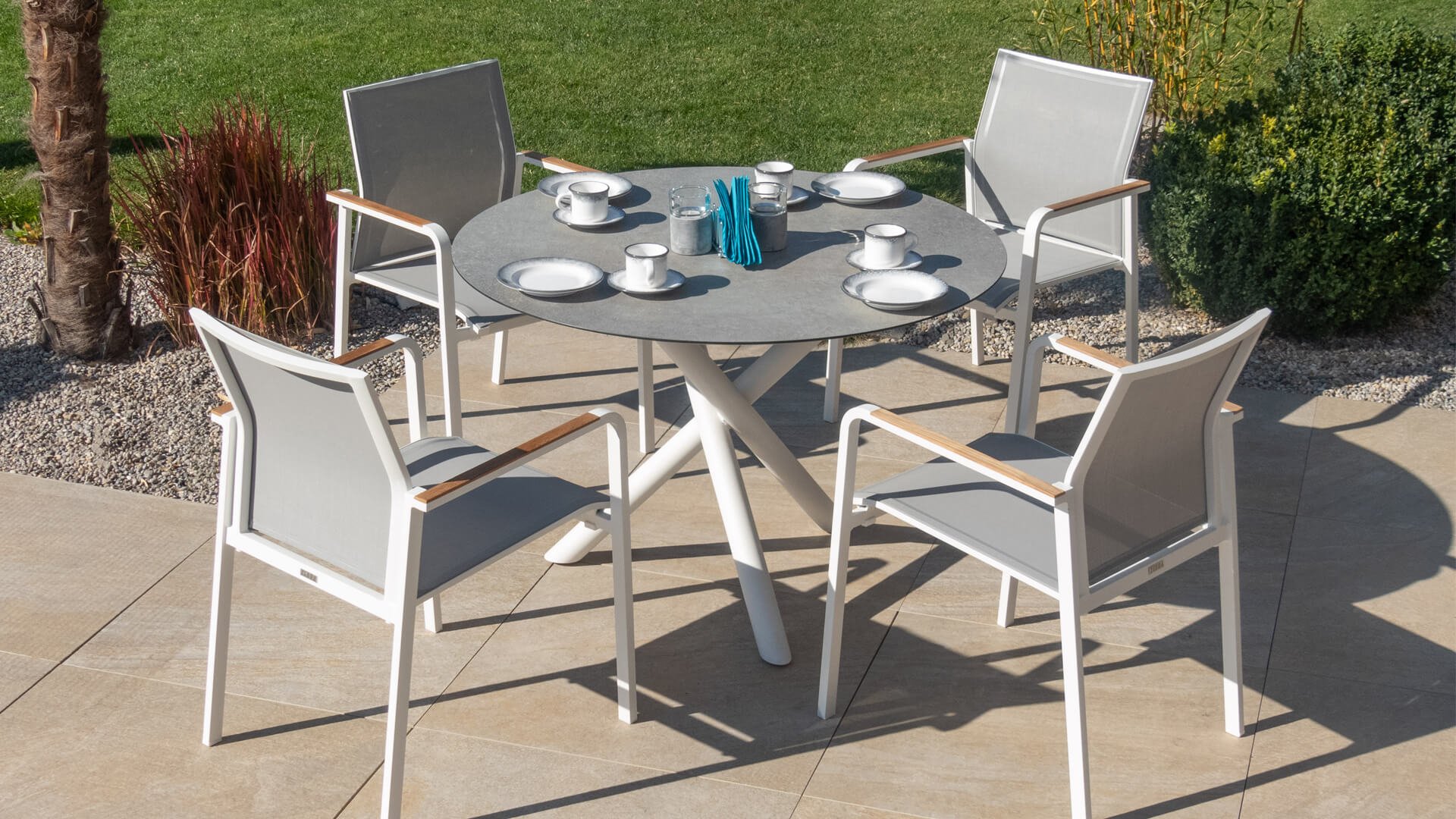 The Zebra Greenline Bee dining series is stackable. Available in the following versions: Zebra Bee Graphite with aluminum armrest, Zebra Bee Graphite with teak armrest & Zebra Bee White with teak armrest. The frames are powder-coated aluminum in the colors Graphite or White. The textile used is Batyline® fabric, a proven synthetic fabric that is breathable and tear-resistant for multiple years. The color of the Batyline fabric is Carbon grey for the Graphite chairs and Light grey for the white version.