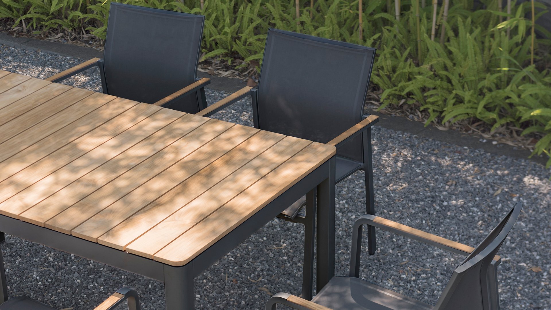 The Zebra Greenline Bee garden chair stackable series. Available in the following versions: Zebra bee Graphite alu-arm, Zebra Bee Graphite teak-arm & Zebra Bee White teak-arm. The frames are powder-coated aluminum in the color Graphite or White. The textilene used is Batyline® fabric, a proven synthetic material that is breathable and tear-resistant for multiple years. The color of the Graphite chairs is Carbon grey, while the white version features the color Light grey.