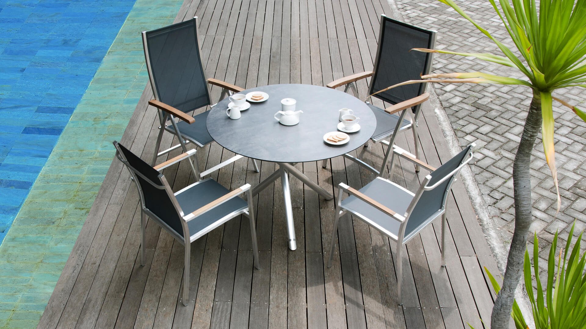 The Zebra One Dining: The frame of brushed stainless steel is covered with Dark Grey or Dark Platinum colored textile fabric. This stainless steel stackable chair 'One' from Zebra is not only an ergonomically perfected chair, but also convinces with its minimalist design and finely recessed teak armrest in stainless steel. The Zebra One garden chair is characterized by a higher backrest than usual for stacking chairs, creating a comfortable seating comfort. There are also stackable and adjustable chairs available in this series.