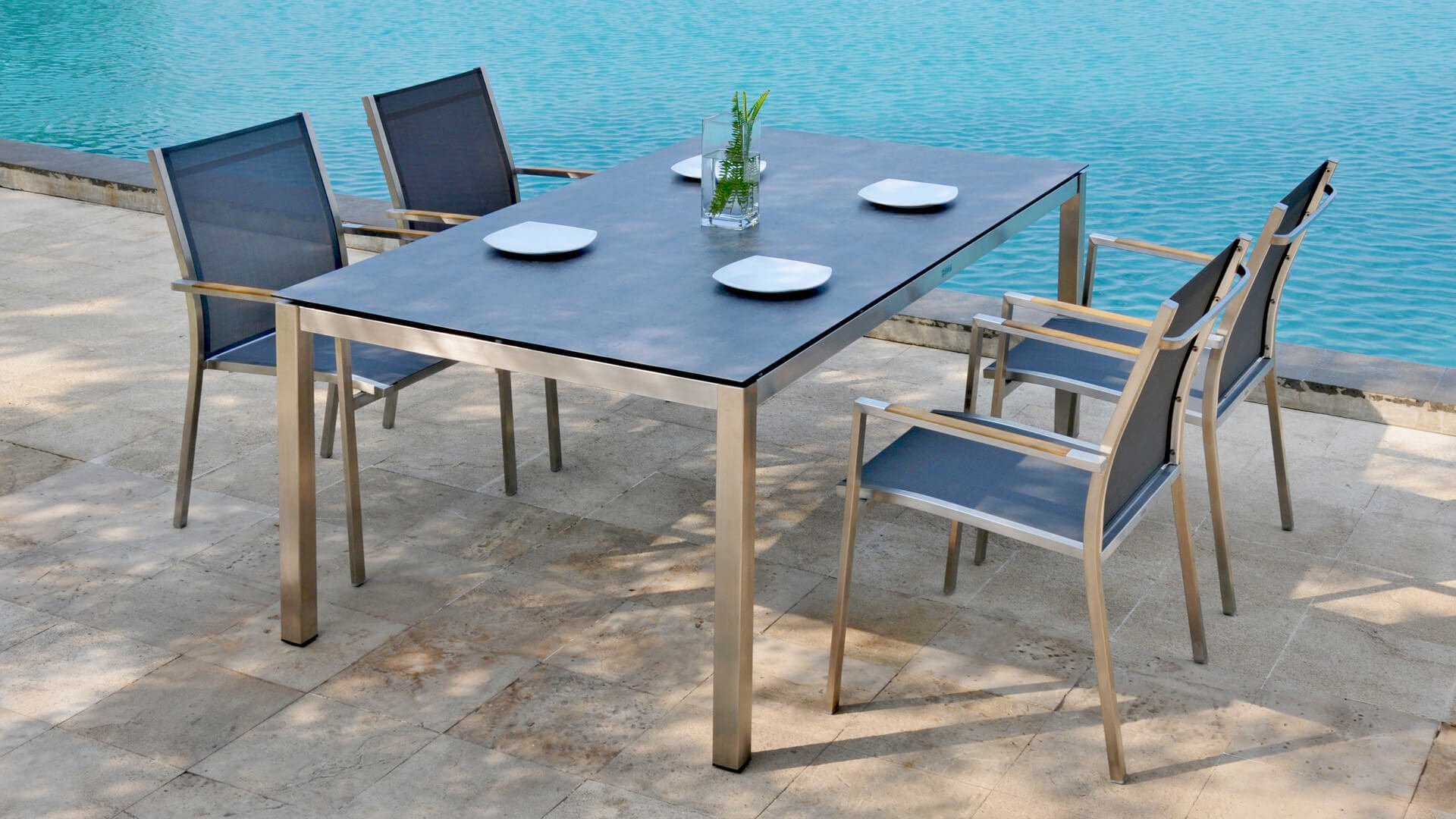 The Zebra One Dining: The brushed stainless steel frame is covered with Dark Grey or Dark Platinum colored textile fabric. This stainless steel stackable chair 'One' from Zebra is not only an ergonomically perfected chair, but also convinces with its minimalist design and finely recessed teak armrests in stainless steel. The Zebra One garden chair is characterized by a higher backrest than normal for stackable chairs, creating a wonderful seating comfort. Stackable and adjustable chairs are also available in this series.