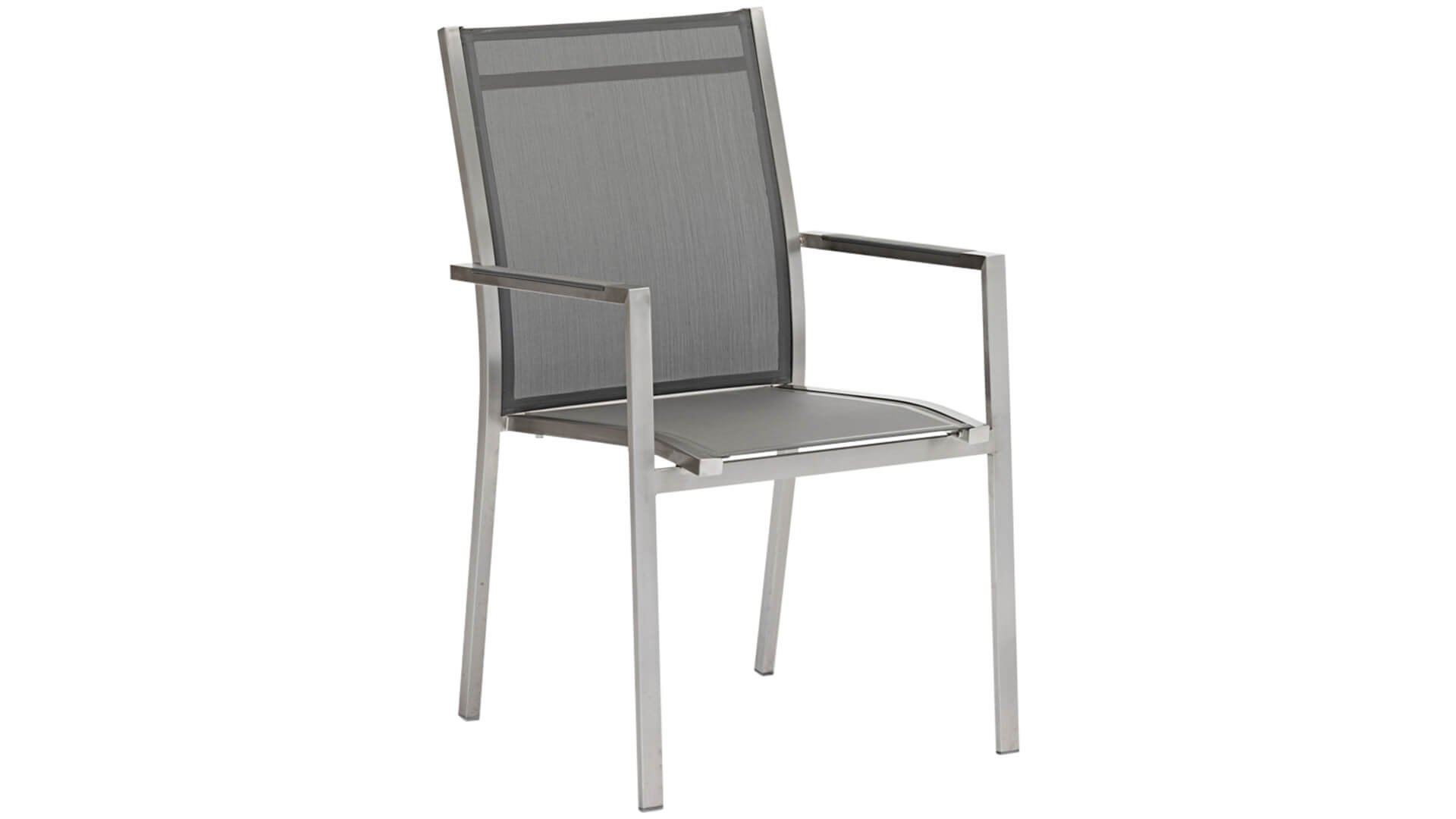 The Zebra One series. The frame made of brushed stainless steel is covered with a dark grey or dark platinum colored textilene fabric. This stainless steel stacking chair 'One' from Zebra is not only an ergonomically perfected chair but also impresses with its minimalist design and finely recessed teak or textilene armrests in stainless steel. The Zebra One garden chair is characterized by a higher backrest than is usual for stacking chairs, thus creating a wonderful seating comfort. There is also an adjustable/folding chair in the same Zebra One series.