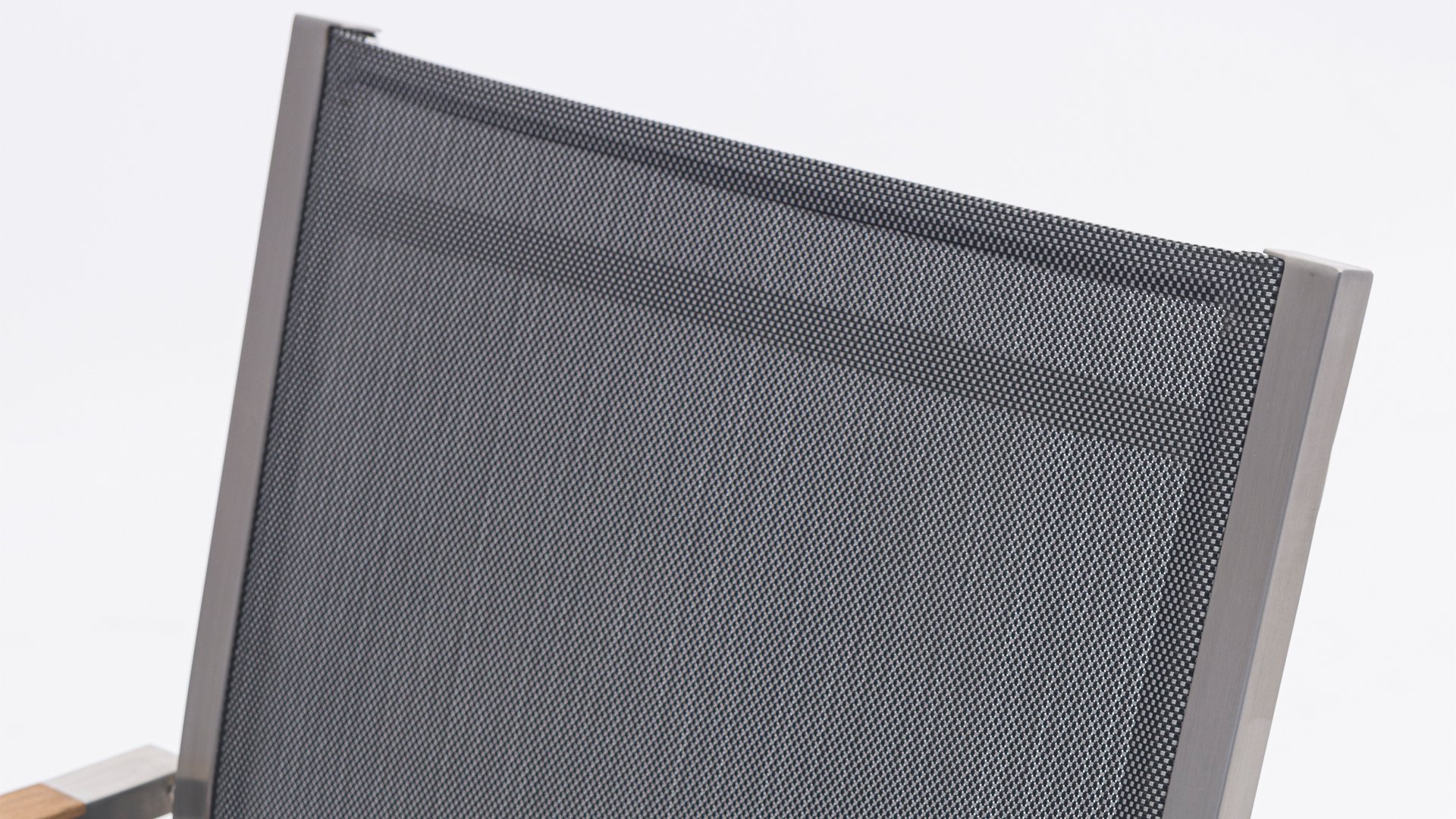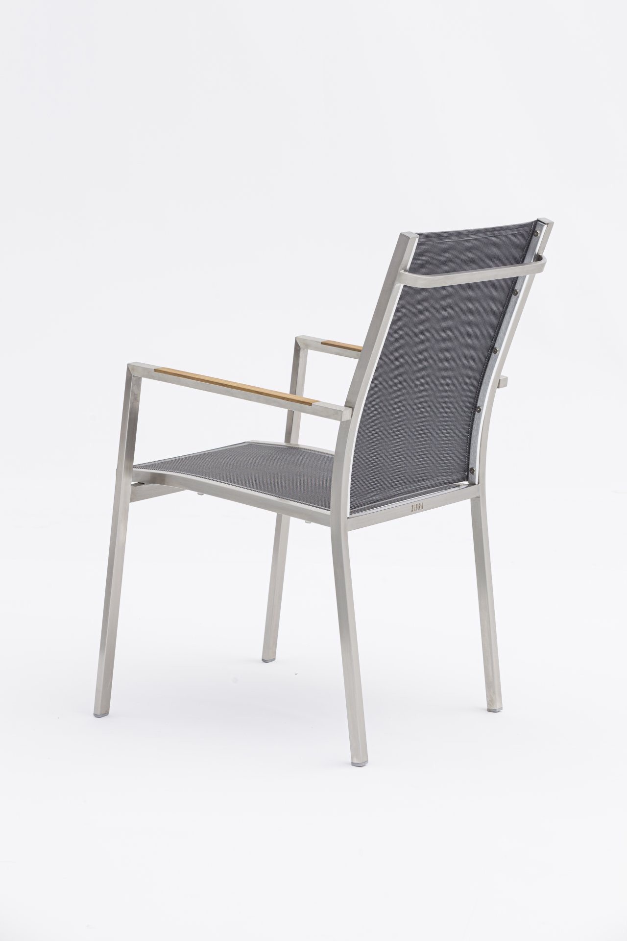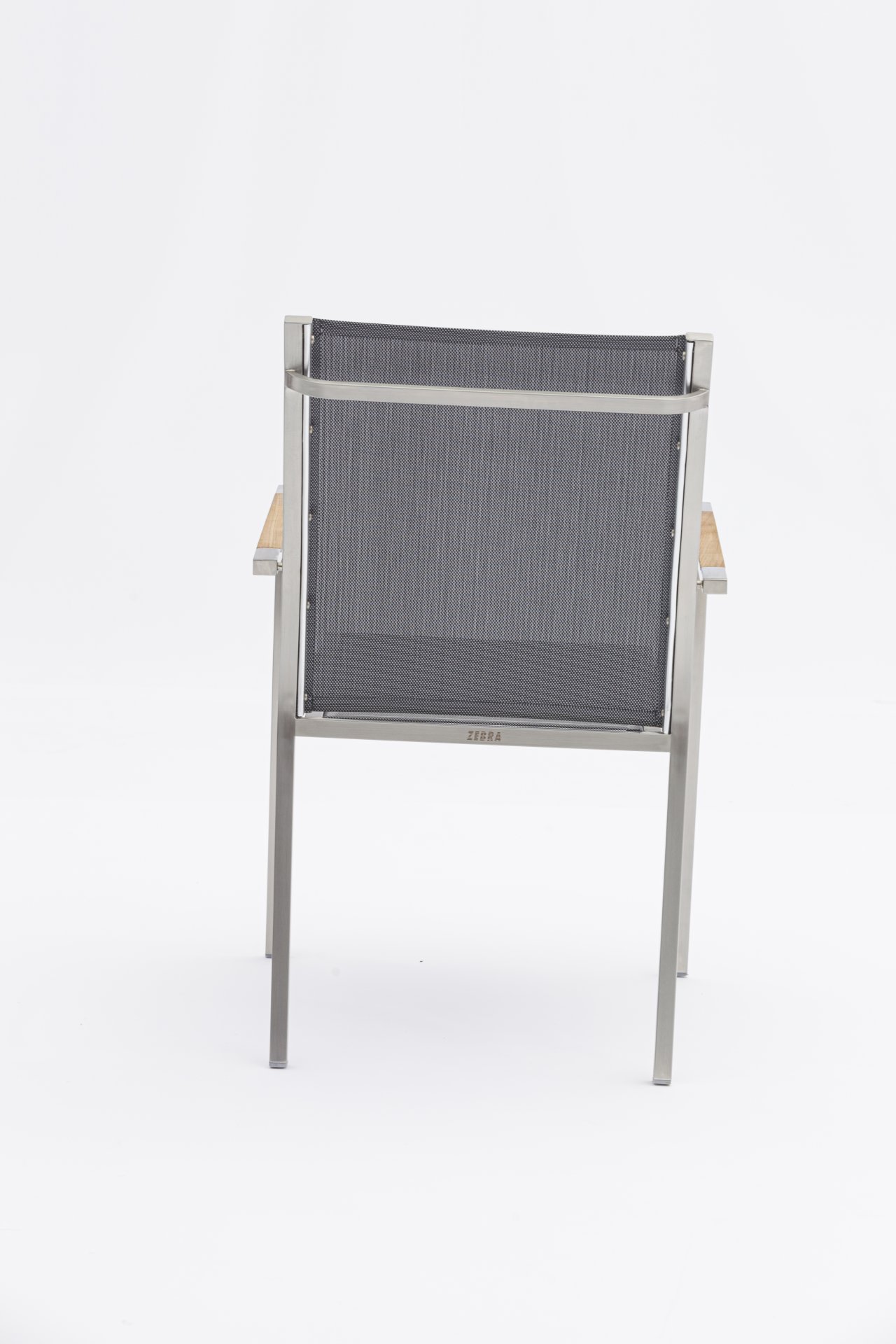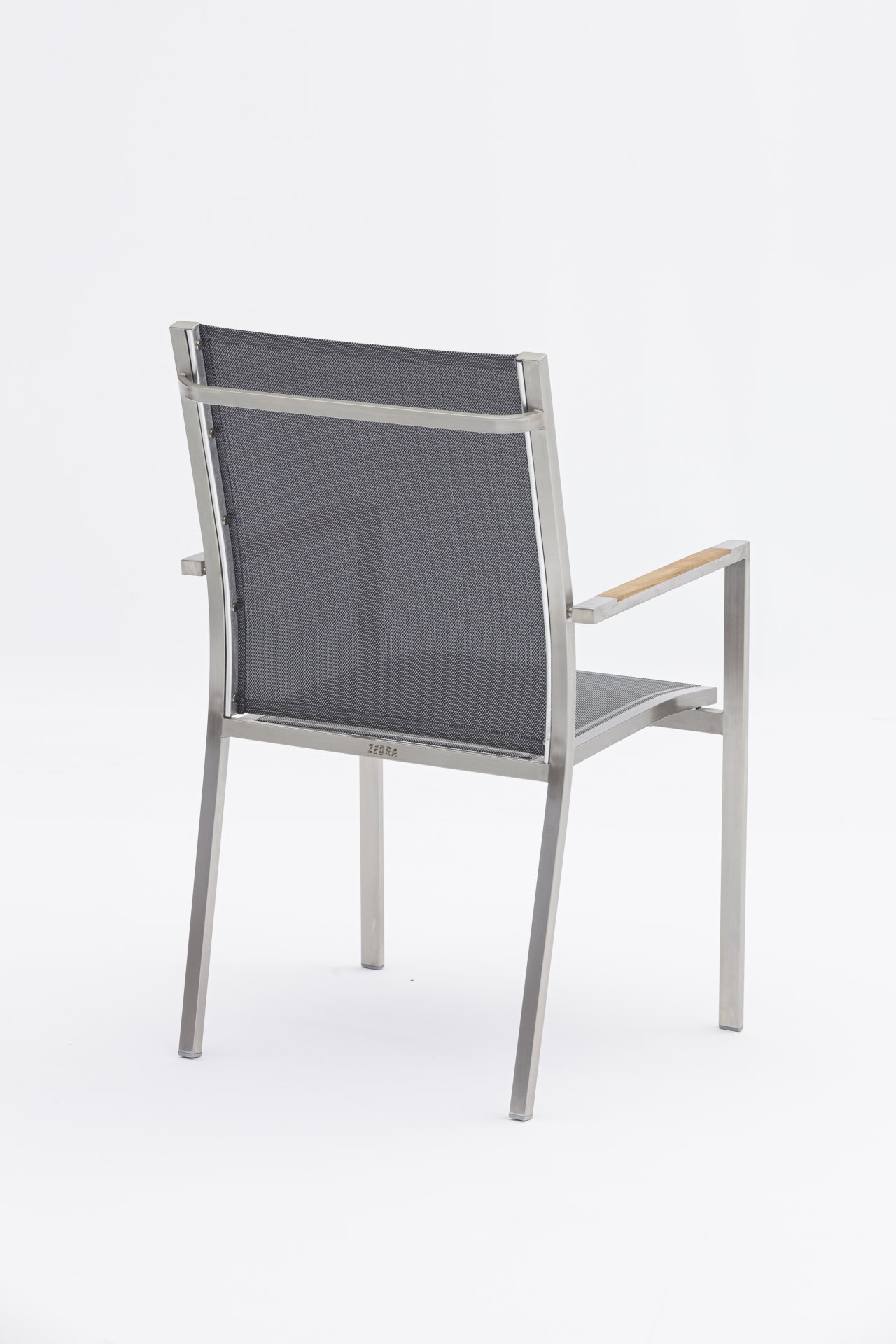 The Zebra One series. The frame of brushed stainless steel is covered with a Dark grey or Dark platinum colored textilene fabric. This stainless steel stacking chair 'One' from Zebra is not only an ergonomically perfected chair but also impresses with its minimalist design and finely recessed teak or textilene armrest in stainless steel. The Zebra One garden chair is characterized by a higher backrest than is usual for stacking chairs, creating a delightful sitting comfort. Additionally, there is an adjustable/folding chair in the same Zebra One series.