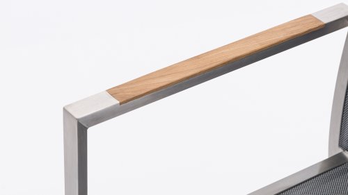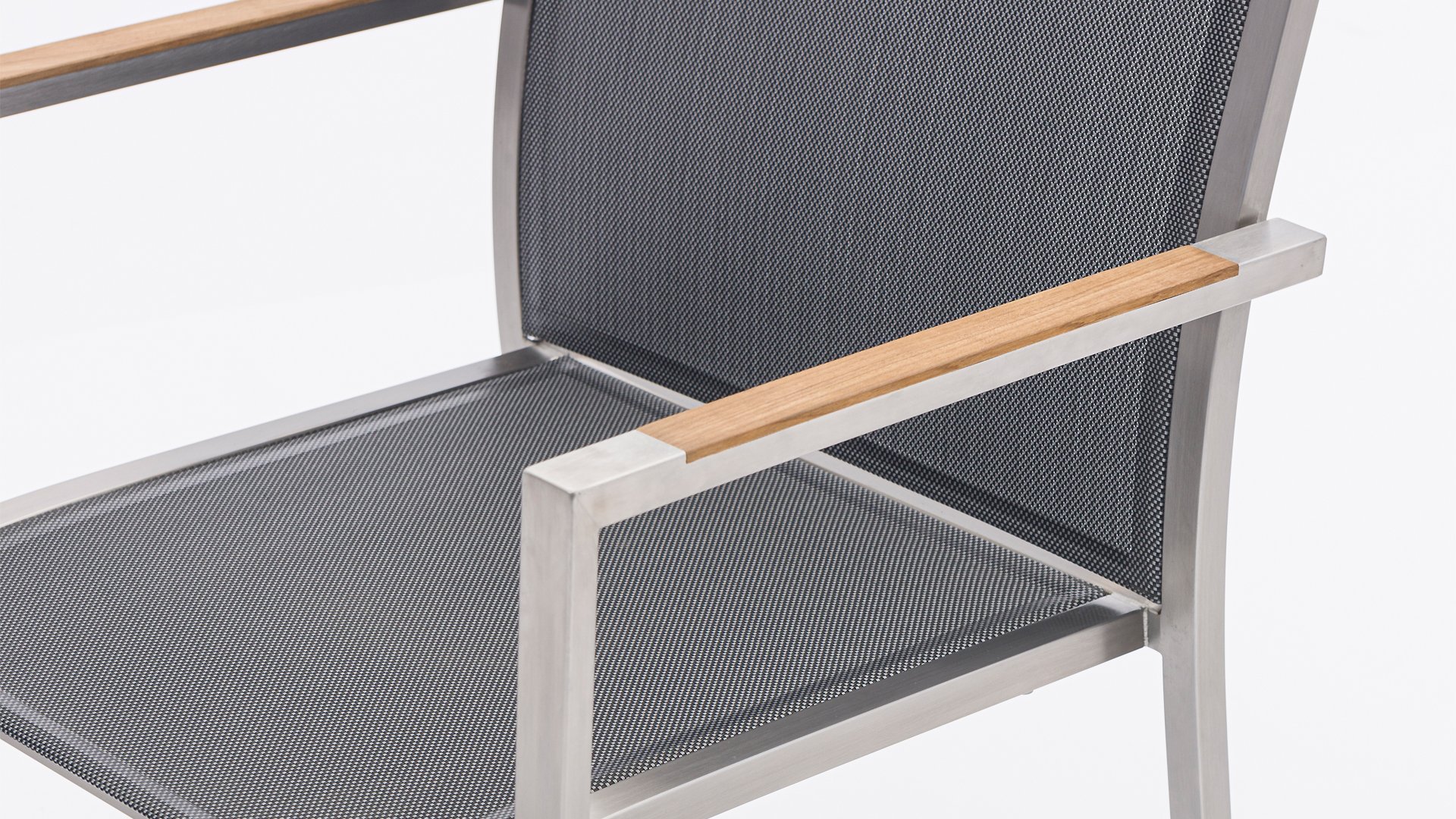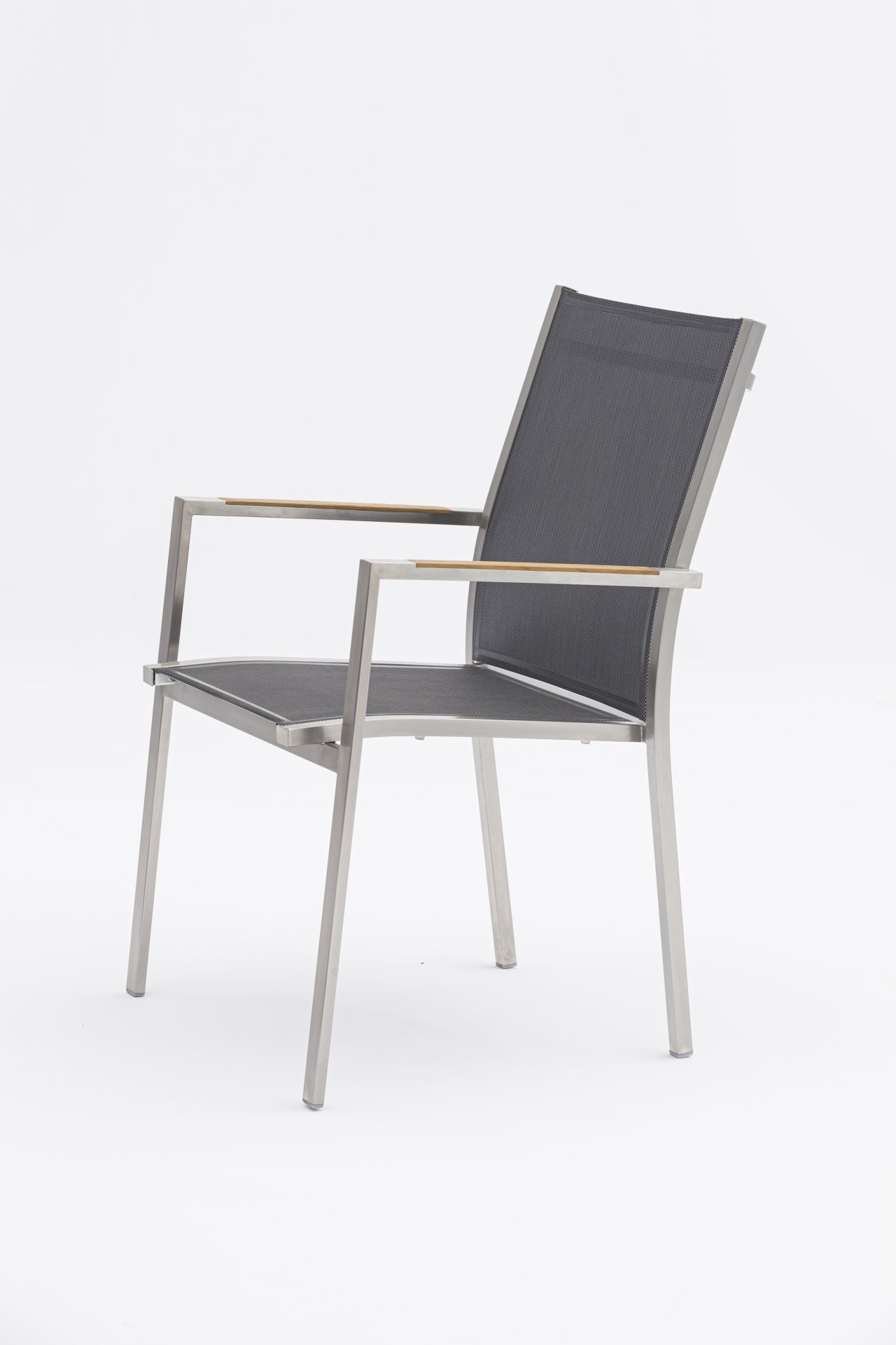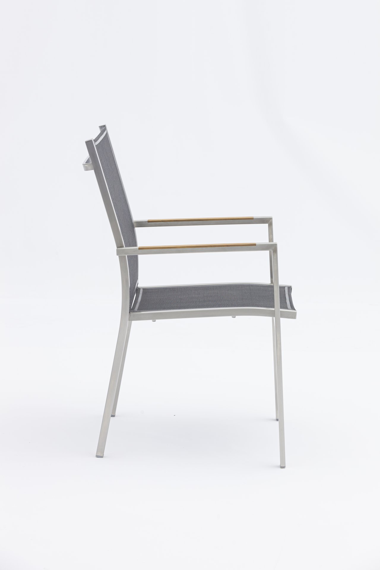 The Zebra One series. The frame of brushed stainless steel is covered with a Dark grey or Dark platinum colored textilene fabric. This stainless steel stacking chair 'One' from Zebra is not only an ergonomically perfected chair but also impresses with its minimalist design and finely recessed teak or textilene armrest in stainless steel. The Zebra One garden chair is characterized by a higher backrest than is usual for stacking chairs, creating a delightful sitting comfort. Additionally, there is an adjustable/folding chair in the same Zebra One series.