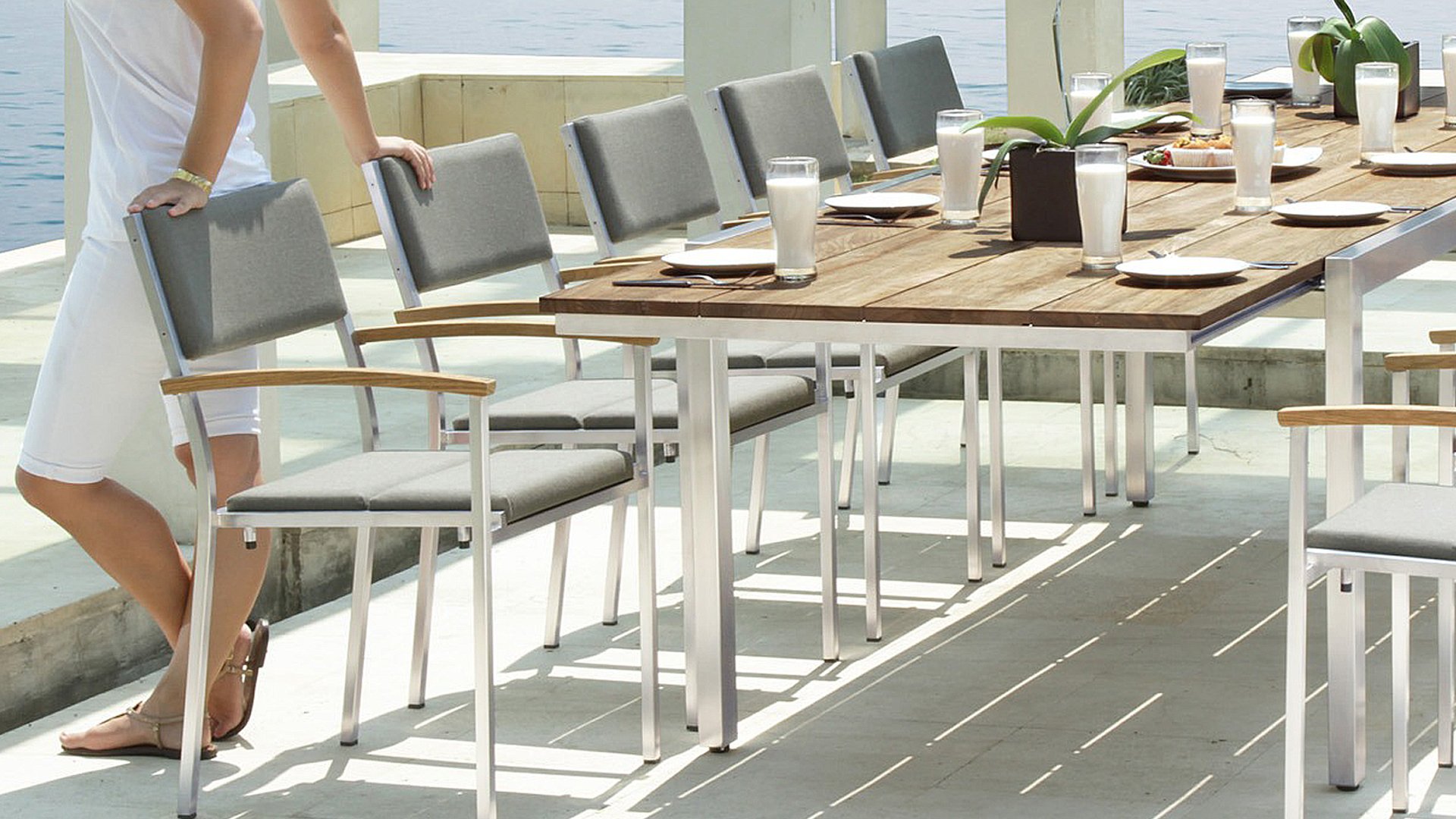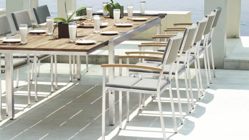 The Zebra Greenline Quadux stackable garden chair series. The brushed stainless steel frame is covered with a smoke-colored Sunbrella® fabric. The SunbrellaTextilene used is a proven synthetic fabric that is breathable and tear-resistant for several years. The Zebra Greenline series combines contemporary, ecology, and sustainability among other things. In the Greenline corporate concept, the issue of sustainability and the selection of environmentally friendly materials, which are processed into comfortable, beautifully designed, timeless furniture, are combined.
