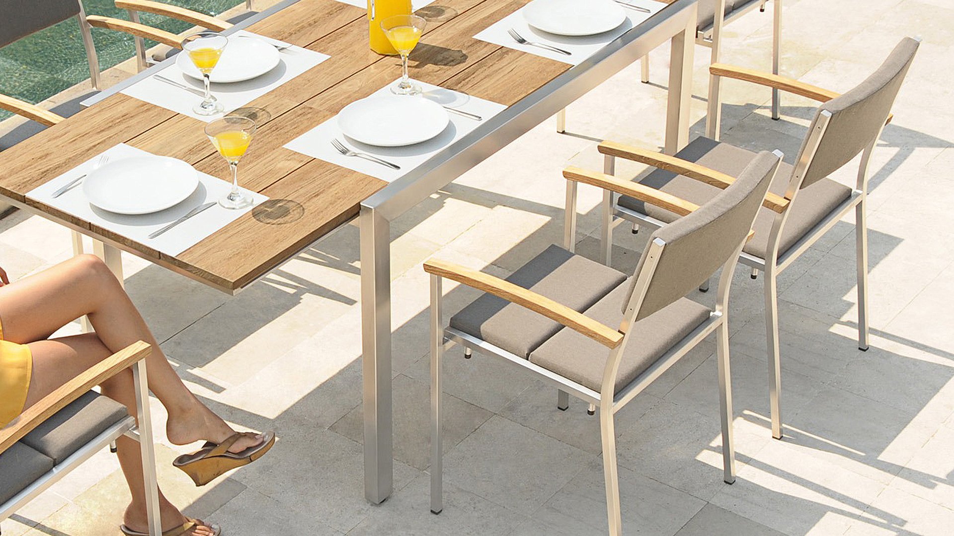 The Zebra Greenline Quadux garden chair stackable series. The brushed stainless steel frame is covered with a smoke-colored Sunbrella® fabric. The SunbrellaTextilene used is a proven synthetic fabric that is breathable and tear-resistant for several years. The Greenline series from Zebra combines contemporary, ecological, and sustainability among others. In the Greenline corporate concept, the issue of sustainability and the selection of environmentally friendly materials, which are processed into comfortable, beautifully designed, timeless furniture, are incorporated.