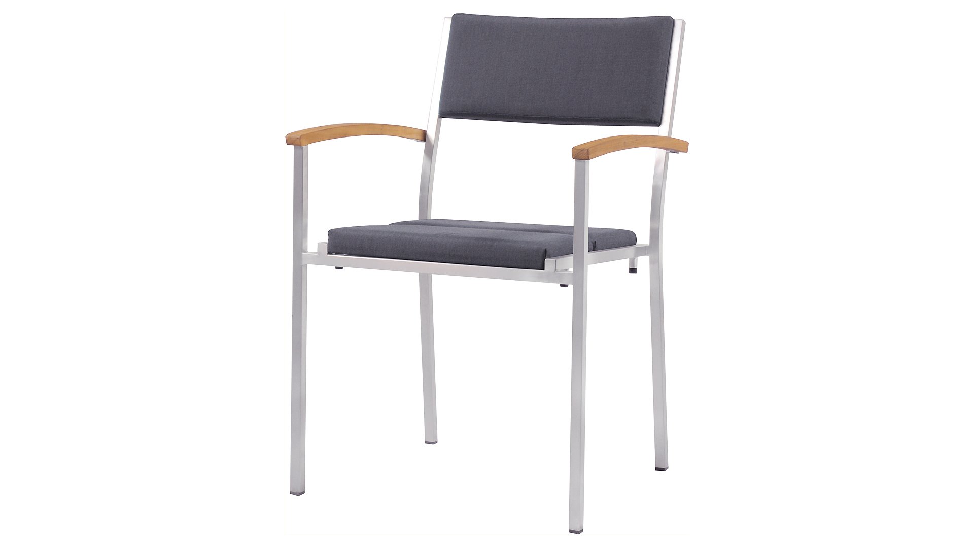 The Zebra Greenline Quadux garden chair stackable series. The frame of brushed stainless steel is covered with a smoke colored Sunbrella® fabric. The SunbrellaTextilene that has been used is a proven synthetic fabric that is breathable and tear resistant for several years. The Greenline series by Zebra combines contemporary, ecological, and sustainability aspects. In the corporate greenline concept, the issue of sustainability and the selection of environmentally friendly materials, which are processed into comfortable, beautifully designed, timeless furniture pieces, are addressed.