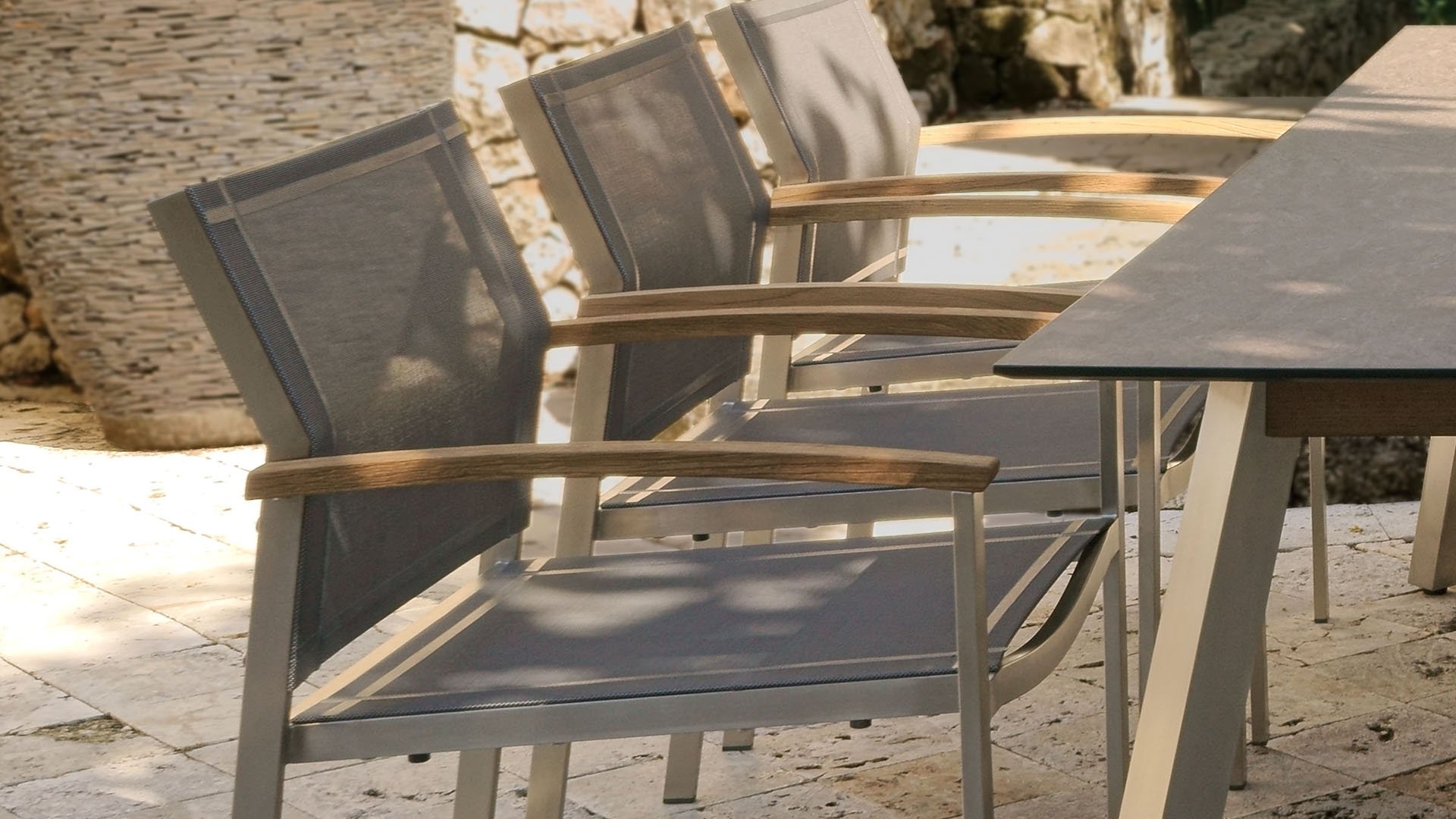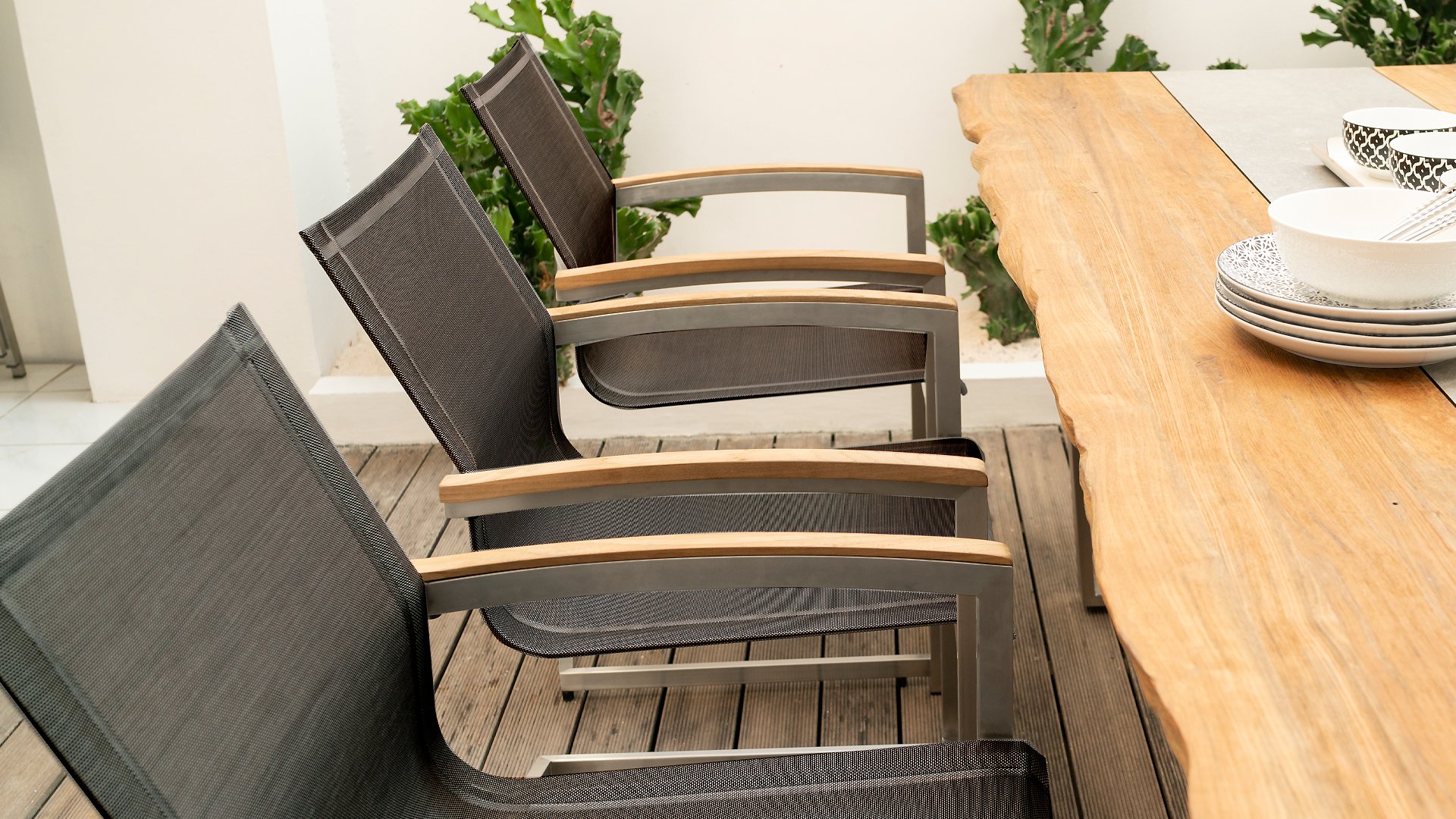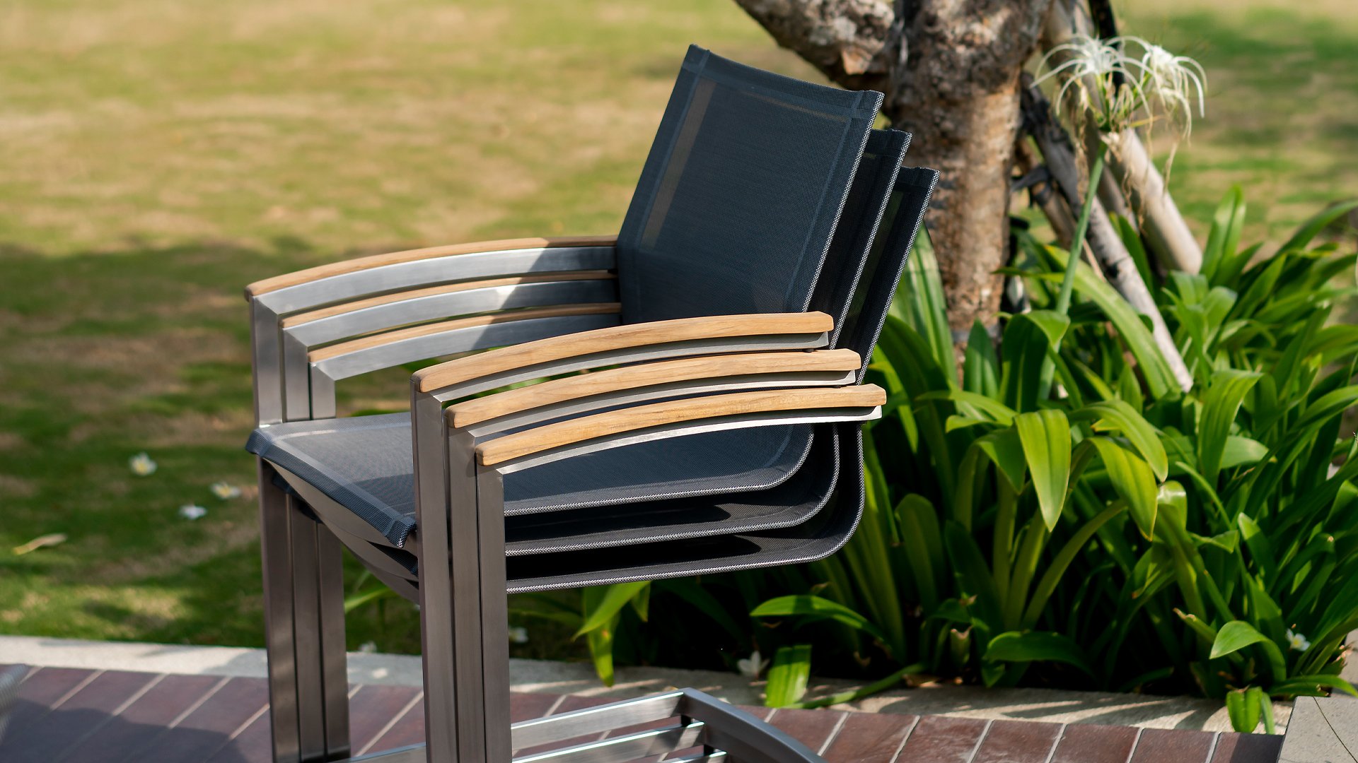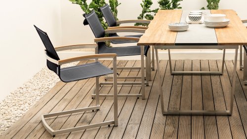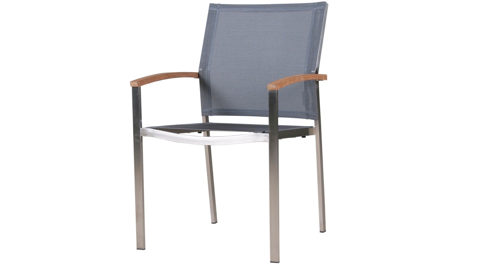 Zebra Setax Dining Chair is timeless and easy to combine. The Zebra Setax provides optimal seating comfort and ease of use. With the teak wood armrest as a stylish accent. This Zebra Setax is available in multiple versions, including one with a slightly higher than usual backrest. The Zebra Setax garden chair is a stackable series. The frame of brushed stainless steel is covered with a colored textilen fabric. Create your garden set, depending on your needs. Whether you choose a small wooden table or a large stainless steel table, the Setax stackable chair is suitable for any occasion. You can simply stack the chairs on top of each other or leave them around the table. This stainless steel stackable chair Setax from Zebra is not only an ergonomically perfected chair, but also convinces with its minimalist design and fine teak wood armrests. Of course, there is also a swing variant of the Setax dining chair available.